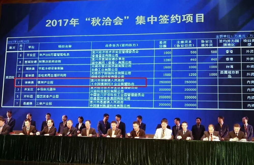 After the opening ceremony, the project signing ceremony was held.A total of 64 projects with a total investment of 3 billion U.S. dollars were signed at the Autumn Fair.Among them, the cooperative project of "China Mold Frame Network" mold frame science and Technology Industrial Park projectOn behalf of Mr. Liu, vice president of China Mold and Frame Network Quality Enterprise Alliance Association, signed a centralized contract with the leaders of Yixing Municipal Party Committee and officially settled in Yixing!